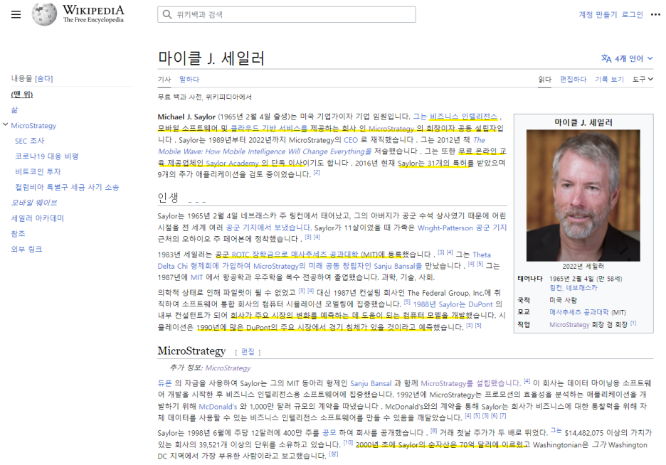 마이클세일러라는 이름이 비트코인으로 연결되는 이름이 되었지만