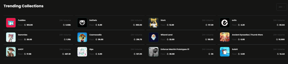 24시간 거래량으로 보면 3.6K를 기록한 Fuddies가 가장 큰 상황