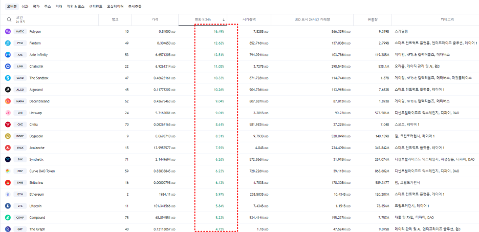 - 솔라나, 앱토스, 수이를 필두로 힘을 못 쓰던 다른 코인들도 동반 상승