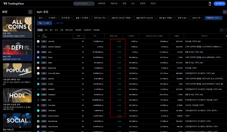4. 디파이 플랫폼들이 우려를 걷어냄에 따라 상승 (24h 변동)