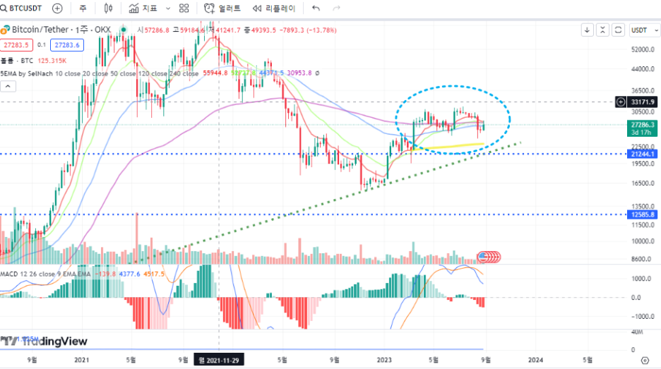 비트코인 계속 횡보하다 저저번주 크게 밀리고 이번 주 약간의 반등에 성공함