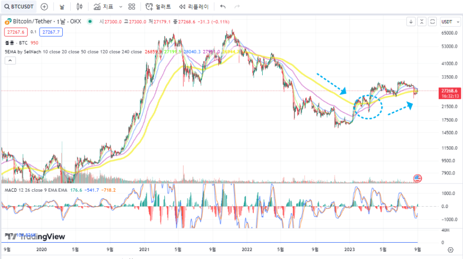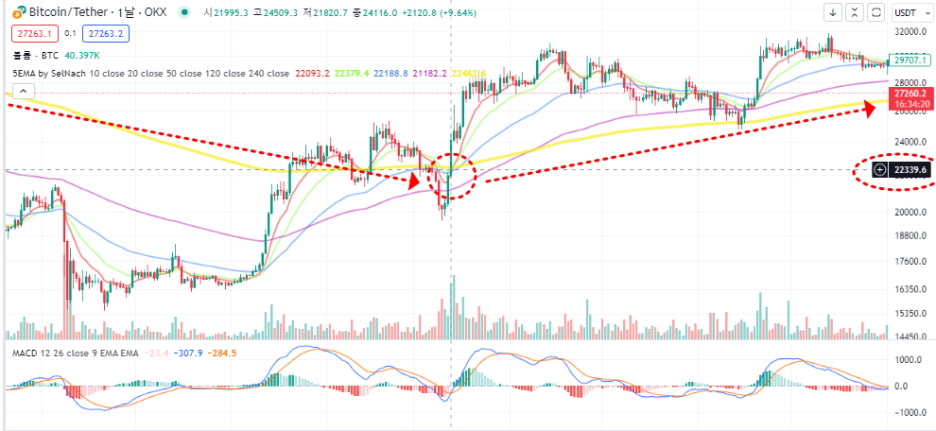240선 기준 상승으로 전환한 23년 2월부터 상승추세에 있으나 여기서 크게 밀리면