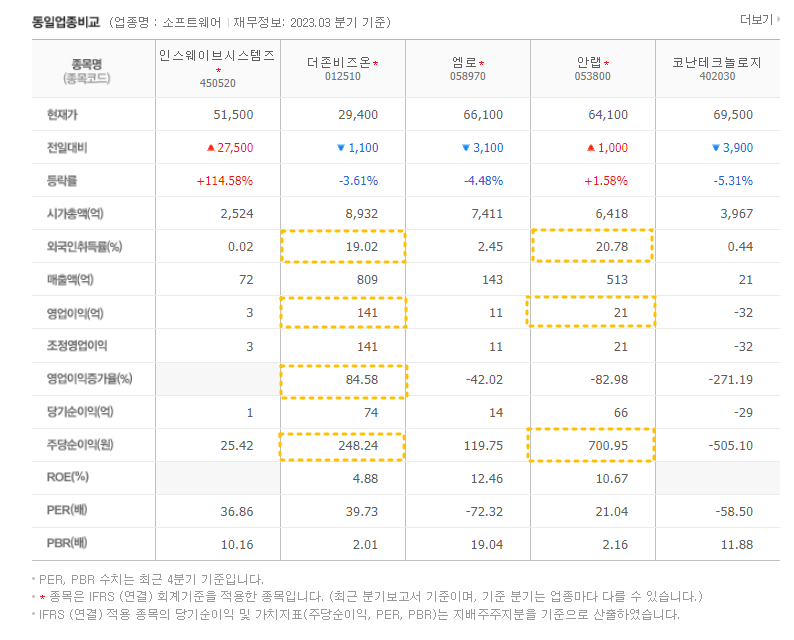 더존비즈온이나 안랩 대비해서 재무적으로는 그렇게 메리트 있어보이지는 않는데