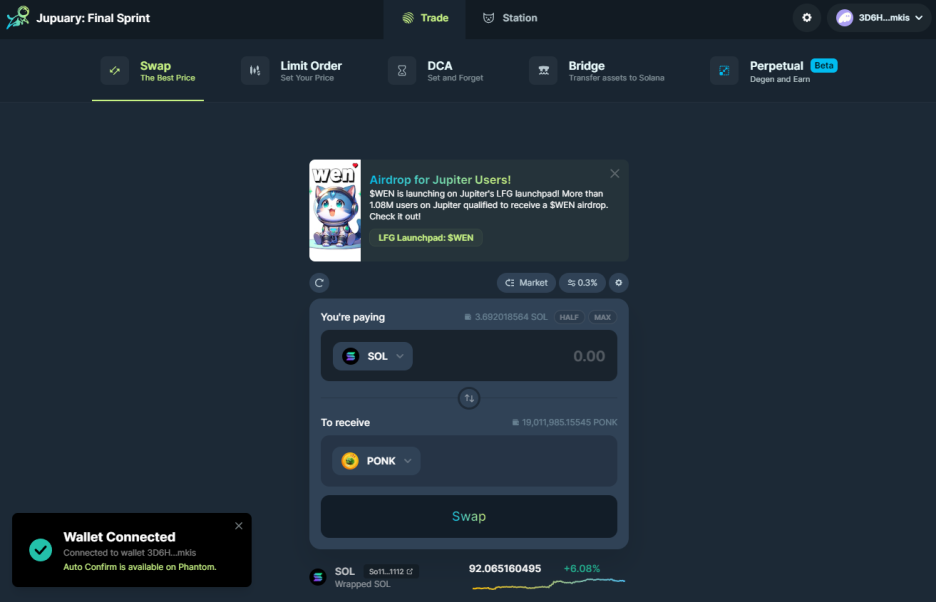 이 페이지에서 $WEN을 청구하거나 스왑, DCA 및 지정가 주문을 사용하여 거래할 수 있습니다.
