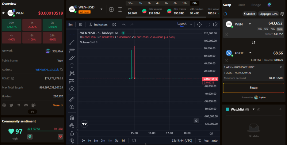 아직 WEN이 솔라나 밈 트렌딩에는 올라 온 상황은 아니니