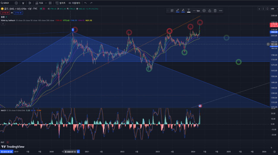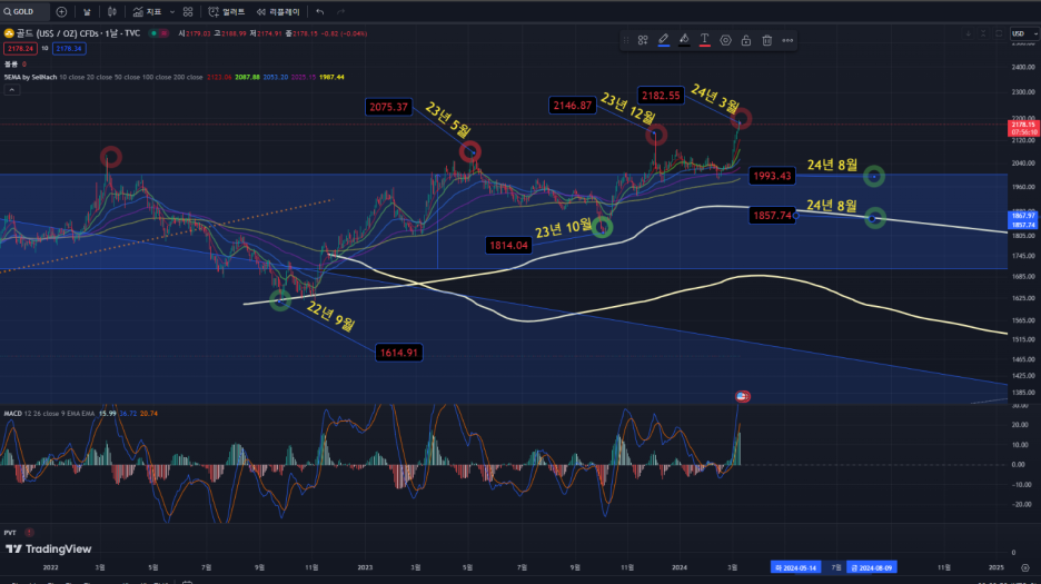 금이 많이 올라가 있는 상황에서 현재를 보면 급반등 중으로 온스당 $2,178 상황으로