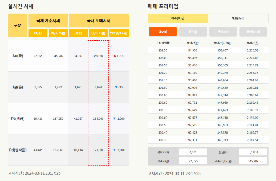금 1돈 3.75g의 국내 도매시세 355,900원