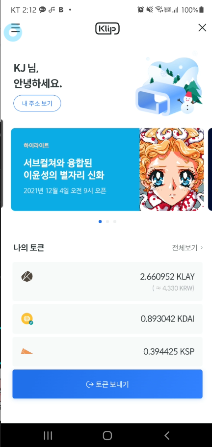 카카오톡의 하단 우측(점점점) 더보기 - 전체서비스 클립 - 나의 토큰