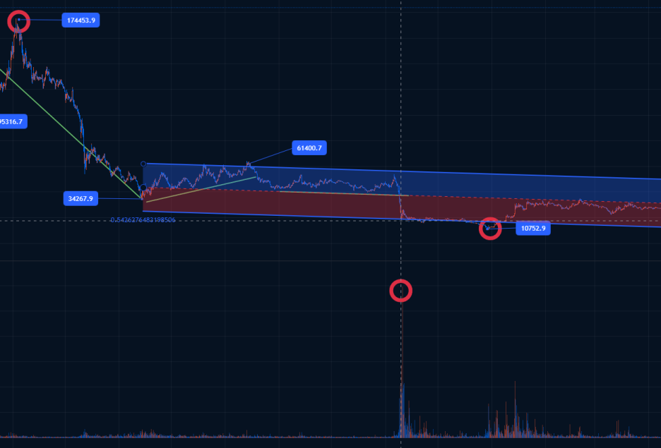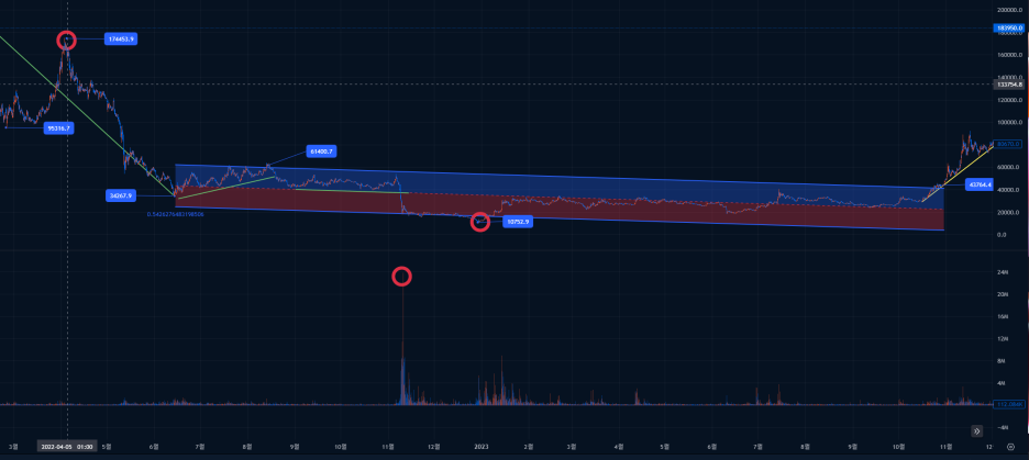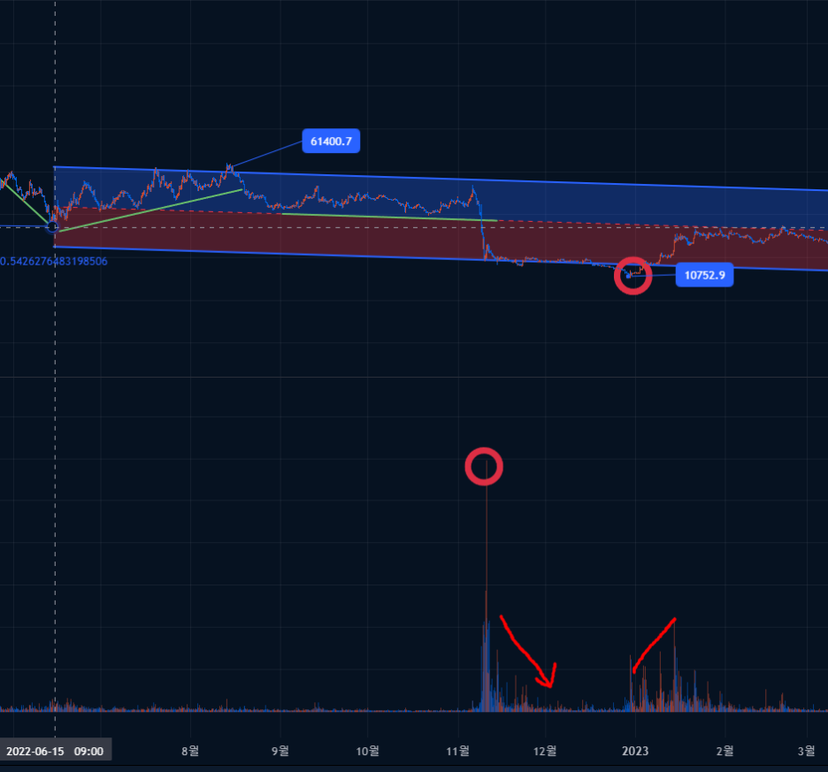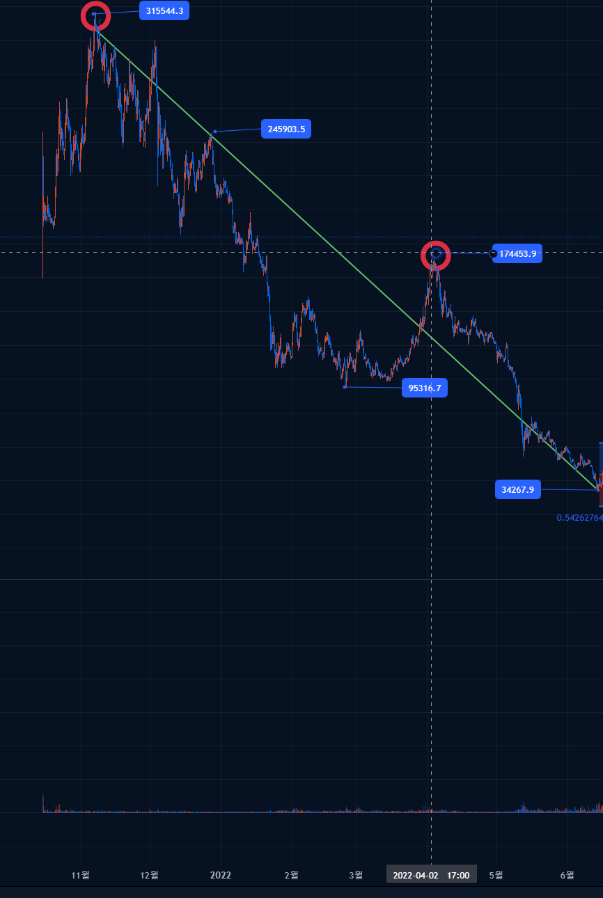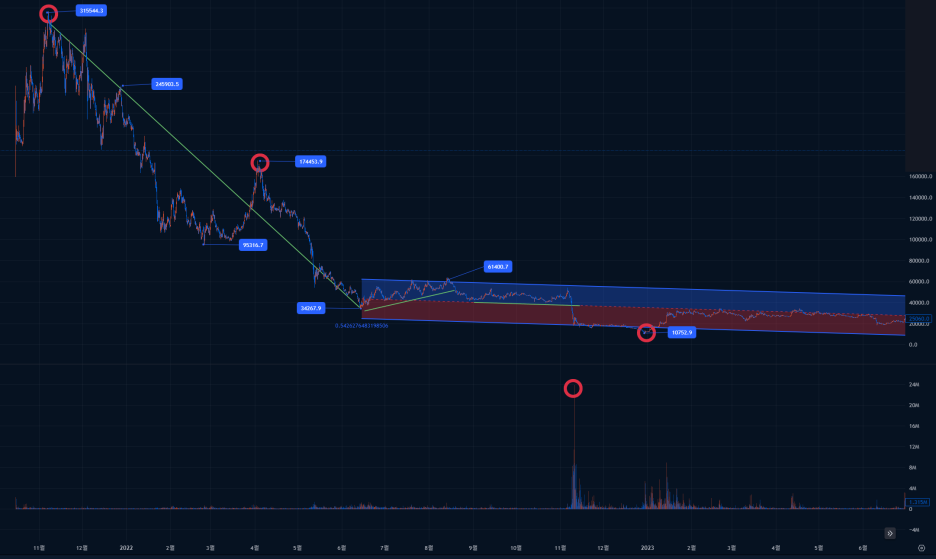 바닥에서 휩소 올라가는 척하며 내리꽂음 3.4만까지 하락 (22년 6월 )