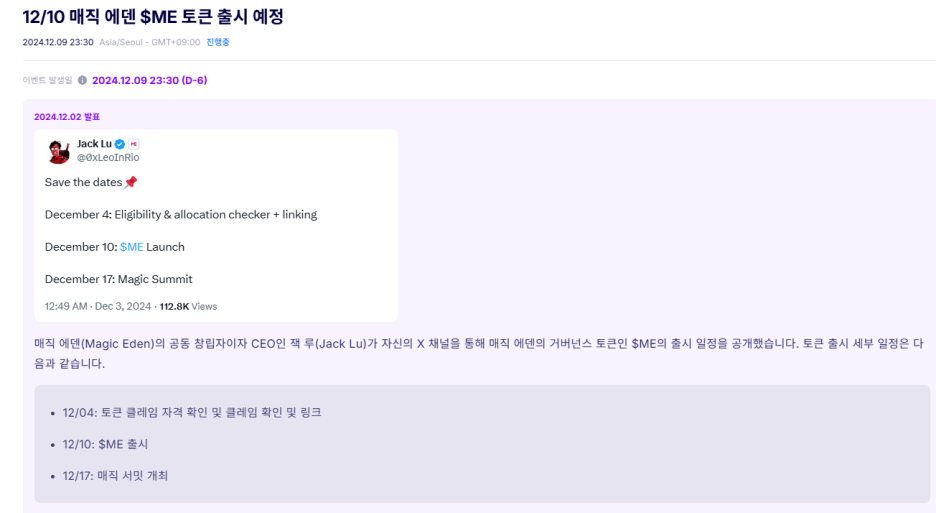 12/10 매직 에덴 $ME 토큰 출시 예정 |쟁글