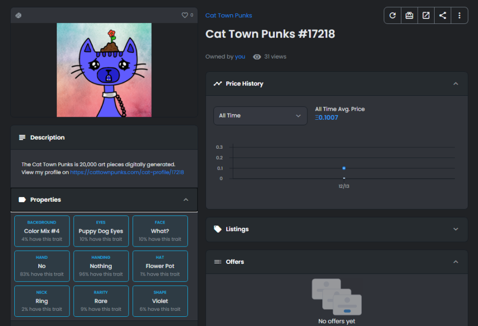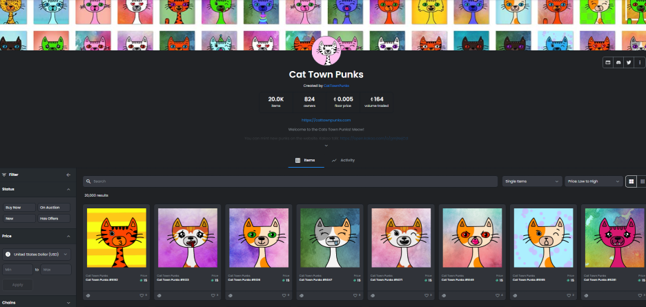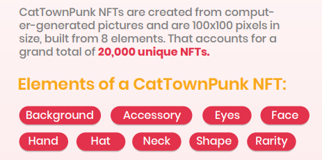 캣타운펑크는 100x100픽셀의 8가지 요소로 구성된 CG 픽쳐로 2만개의 NFT로 구성되어 있습니다.
