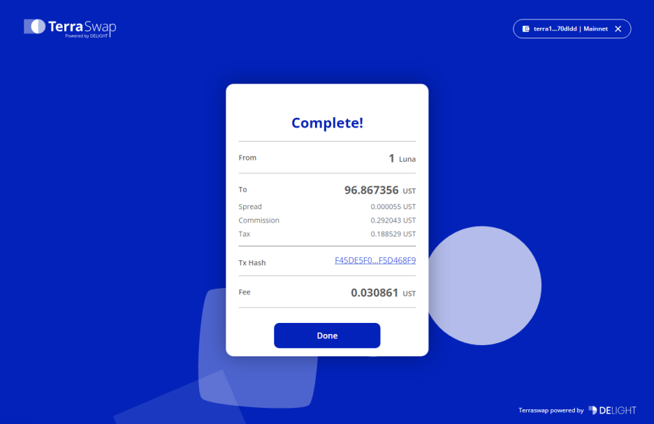 입금이후 지갑연결하시고 테라 생태계 대표스왑사이트인 테라스왑에서 Luna로 UST를 필요한 수량만큼 스왑하시면 됩니다. 아래의 테라 스왑사이트입니다.