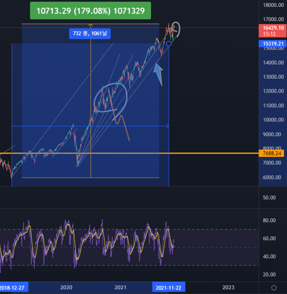 저점과 고점을 보기위해 나스닥의 경우를 보겠습니다.