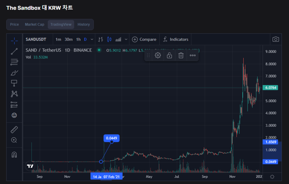 SAND의 2021년 1월 가격은 40~50원대 였고 현재는 $5~$8사이에 형성되어 있습니다.